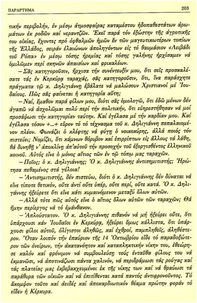 …..Με το ξέσπασμα των αναταραχών στην Κέρκυρα η άνω εφημερίδα δέχτηκε πληθώρα τηλεγραφημάτων από την Αθήνα, τα οποία έλεγαν, ότι διαβήματα στέλνονται από την Κωνσταντινούπολη προς το Παρίσι τη Βενετία και το Βερολίνο – δηλαδή τα ιουδαϊκά κέντρα- στα οποία αναφέρονταν σε πλήθος αντισημιτικών εικόνων με γερμανικά κείμενα, που κυκλοφορούσαν ευρέως στην Σμύρνη…..