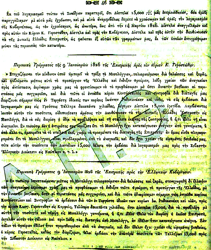 Εξετάσαμεν δε συγχρόνως και αυτόν τον λογαριασμόν τρου Κυρίου Γεροστάθη, τον οποίον εύρομεν εις τα αρχεία τού Συνεδρίου· και τω όντι ο λογαριασμός ούτος εις το όλον της ανωτέρω μνησθείσης ποσότητος φέρει και2ον Κονδύλι εκ Ταλλήρων 2.5οο ως σταλέντων εκ Τεργέστης, αντί Δίστηλων 2,5οο, εξ ου προκύπτει. ή πεpi του Συνεδρίου σημειωθείσα διάφορά εκ Διστήλων 96 12, και αυτήν την διαφοράν, το Συνέδριον την φορτώνει επάνω μας. Αλλά το Συνέδριον, πριν μας καταδικάσει εχρεώστει συγχρόνως να εξετάση και αυτήν την Ημερομηνίαν του λογαριασμού τού κυρίου Κ. Γεροστάθη, του φέροντας την διαφοράν ταύτην, και ήθελεν ιδεί ότι η ημερομηνία αυτού του λογαριασμού, είναι 9η Δεκεμβρίου 1827, ημερομηνία μεταγενεστέρα και της παύσεως μας, και αυτής της αναχωρήσεως μας εκ Λονδίνου. Εχρεώστει δε να εξετάσει επίσης και όλα τα γράμματα, όσα ανωτέρω αναφέραμεν, και όσων τας περικοπάς αντιγράψαμεν, και ήθελεν ιδεί ότι ημείς Δίστηλα επληρώσαμεν, Δίστηλα παραγγείλαμεν να σταλώσι, καί Δίστηλα να ληφθώσι, και εάν τις των εντολοδόχων έσφαλεν, είναι δίκαιον να πληρώσωμεν ημείς αν υποθέση τις ότι λησταΐ ελίστευσον καθ’ οδόν τους άποσταλέντας Γρούπους προς τον Κύριον Γεροστάθην, έπρεπεν ημείς να είμεθα υπεύθυνοι; ερωτώμεν τώρα το Συνέδριον να μας είπη, εάν ήναι δίκαιον να πληρώσωμεν ημείς την διαφορά αυτήν των Λιρών Στερλινών 20 17.