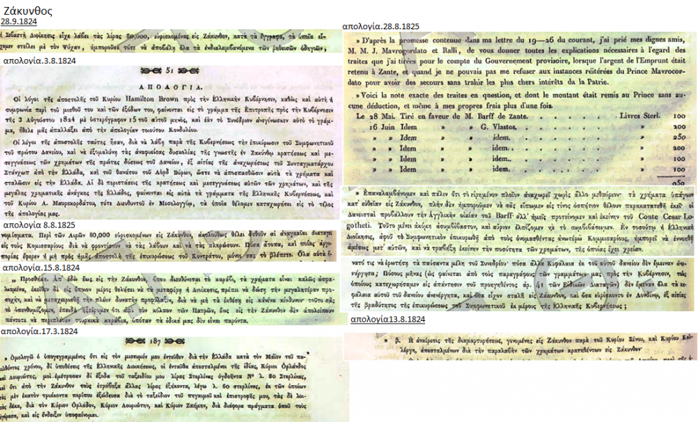 Από διάφορα γράμματα και απ’ όσα εις διαφόρους Εφημερίδας είδομεν, φαίνεται ότι μια γενική κατακραυγή επικρατεί εις την Ευρώπην εναντίων τόσων καταχρήσεων, δια των οποίων, κατ’ αυτάς τας φήμας, η προλαβούσα Διοίκησις κατασκόρπισε κακήν κακώς όσας ποσότητας έφεραν τα δύο δάνεια της Ελλάδος.