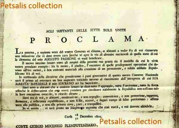 Ο ίδιος ο Μοντσενίγος άμεσα με προκύρηξη του, γνωρίζει στούς πολίτες την άφιξή του σαν απεσταλμένος του Τσάρου για να επιβάλλει την τάξη στη Επτάνησο Πολιτεία.