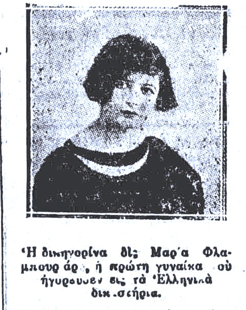 Δημοσιεύται:. Μια νεαρά δεσποινίδα σηκώνεται τότε από τις θέσεις του ακροατηρίου και με σταθερό βήμα κατευθύνεται προς τα έδρανα των συνηγόρων υπεράσπισης. Είναι η Μαρία Φλαμπουριάρη, η πρώτη δικηγόρος που εμφανίζεται στην Ελλάδα σε ακροατήριο δικαστηρίου. Οι συνήγοροι που κάθονται εκεί μετακινούνται άλλοι στα δεξιά κι άλλοι στα αριστερά και αφήνουν τη δεσποινίδα να καθίσει ανάμεσά τους. Τότε ενοχλημένος ο Πρόεδρος του δικαστηρίου Δάρας με τα όσα συμβαίνουν δηλώνει ότι αρνείται να επιτρέψει την παράσταση γυναίκας στο δικαστήριο και απευθυνόμενος στην νεαρά κοπέλα της ζητά να αποχωρήσει.Η δικηγόρος Φλαμπουριάρη διατηρώντας τη ψυχραιμία της σηκώνεται από το έδρανό της και δηλώνει με σταθερή φωνή ότι έχει το δικαίωμα της παραστάσεως στο ακροατήριο. Ο Δικηγόρος Δαμασκηνός, προκαλώντας αίσθηση στο ακροατήριο, ανακοινώνει ότι στην υπεράσπιση θα συμμετέχει και η δεσποινίς Φλαμπουριάρη ως συνήγορος του κατηγορουμένου Καραγιάννη. Όπως περιγράφει η εφημερίδα Κοσμική Κίνηση, στο φύλλο της 28ης Φεβρουαρίου 1926, στη Στήλη Ειδήσεις της Ημέρας, «είναι η δεσποινίς Φλαμπουριάρη, η πρώτη δικηγορίνα η οποία εμφανίζεται στην Ελλάδα σε ακροατήριο».«Γίνονται δεκταί γυναίκες ως δικηγόροι;» ερωτά τάχα σα να μη γνωρίζει ο Πρόεδρος του δικαστηρίουΤότε ακούγεται από το ακροατήριο και τους συνηγόρους της υπόθεσης ο κόσμος να απαντά με μια φωνή«Μάλιστα, μάλιστα» που αντιστοιχεί στην απάντηση «γίνονται, γίνονται»Και ο Πρόεδρος ύστερα από την απάντηση που λαμβάνει και από τον κόσμο που βρίσκεται στην αίθουσα, λες και η απάντηση της Φλαμπουριάρη δεν του αρκούσε, μάλλον μη μπορώντας να πράξει διαφορετικά, παρατηρεί«Αν και δεν μας χρειάζονται…. πολλές γλώσσες, τέλος πάντων. Αλλά πρέπει να καταβληθεί και το σχετικόν φορόσημον» Σε συνέχεια του αμήχανου συμβάντος, ο συνήγορος Δαμασκηνός, δήλωσε στο δικαστήριο ότι τρέφει τόση εκτίμηση στη συνάδελφό του ώστε το απόγευμα θα την άφηνε αποκλειστικά μόνη στο δικαστήριο Τότε καταβάλλεται και το «σχετικόν φορόσημον» στο γραμματέα της έδρας και κάπως έτσι… και επίσημα πλέον εισέρχεται στη δίκη και η πρώτη γυναίκα δικηγόρος η δεσποινίδα Μαρία Φλαμπουριάρη