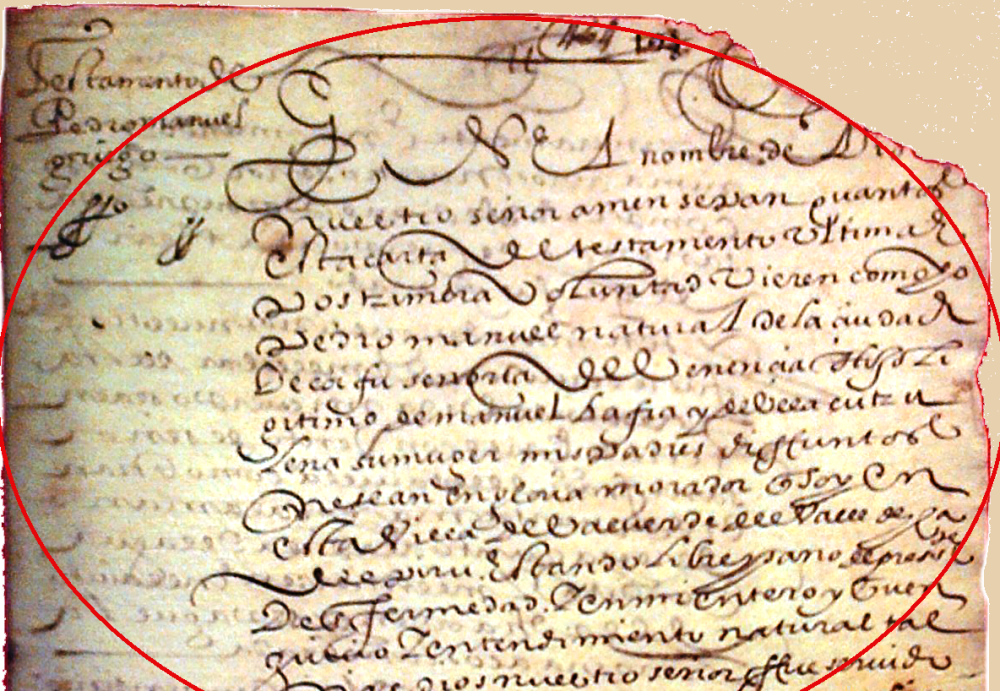 Στη διαθήκη του Πέτρου Μανουήλ του Έλληνα, κατοίκου της Ίκα, καταγόμενου από την Κέρκυρα, Άρχοντα της Βενετίας, γιου του Μανουήλ Μπάφρα και της Βέλα Κουτρουλένα, στην οποία ορίζει τους Νικολάο ντε Κάντια και Φρανθίσκο ντε Μπόρχα ως εκτελεστές. Ενώπιον του Χουάν ντε Αγιάλα, συμβολαιογράφου.