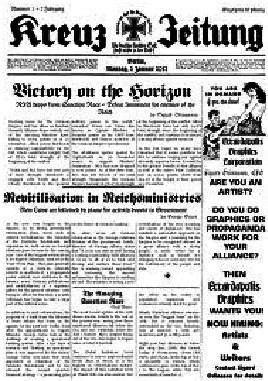 Η εφημερίδα Kreutzzeitung ιδρύθηκε το 1840 και ήταν η φωνή των Πρώσων Συντηρητικών. Το 1937 πέρασε στα χέρια του ναζιστικού κόμματος. Χαρακτηριστικό της εφημερίδας είναι ο σταυρός στην μέση, ο οποίος διατηρήθηκε ακόμη κι όταν η εφημερίδα επιτάχθηκε από τους Ναζί.