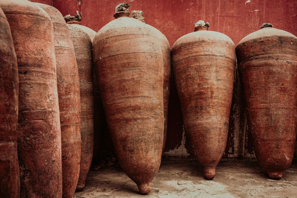 H αποθήκευση του ποτού γίνονταν σε μεγάλα κεραμικά δοχεία και η μεταφορά τους